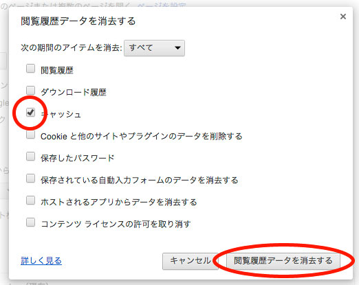 検索してみると、ツールバーの「環境設定」から「閲覧履歴を消去」を選択して、以下のように「キャッシュ」にチェックを入れて「閲覧履歴データを消去する」をクリックすると解決するようなのですが、自分の場合は一向に直りません。