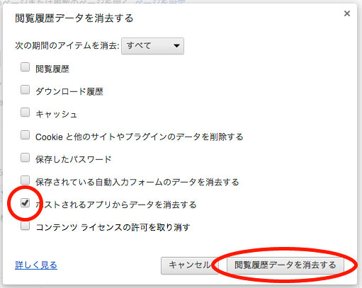 そこで、ひとつずつチェックを入れて試してみたのですが、以下のように「ホストされるアプリからデータを消去する」にチェックを入れると、見事に直りました。