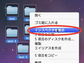 【1】コンテキストメニュー表示時に「option(ALT)」キーを押します。「情報を見る」が「インスペクタを表示」に変わりますので、これをクリックします。(ショートカットキーは「Command」+「option(ALT)」+「i」)