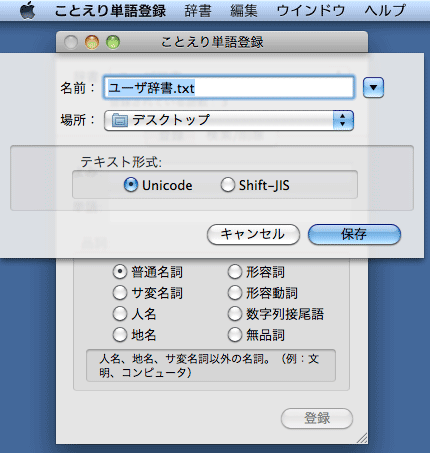 【3】ダイアログが表示されるので、保存先を指定。テキスト形式はどちらでも良いですが、Mac OS X標準の「テキストエディット」で開きたい場合は、「Shift-JIS」にします。